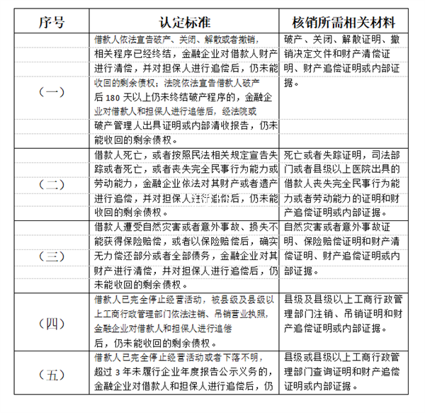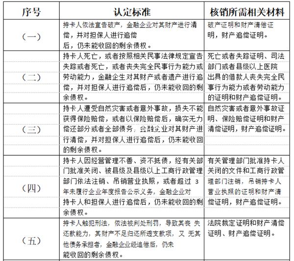 银行卡透支款项呆账认定标准及核销所需相关材料